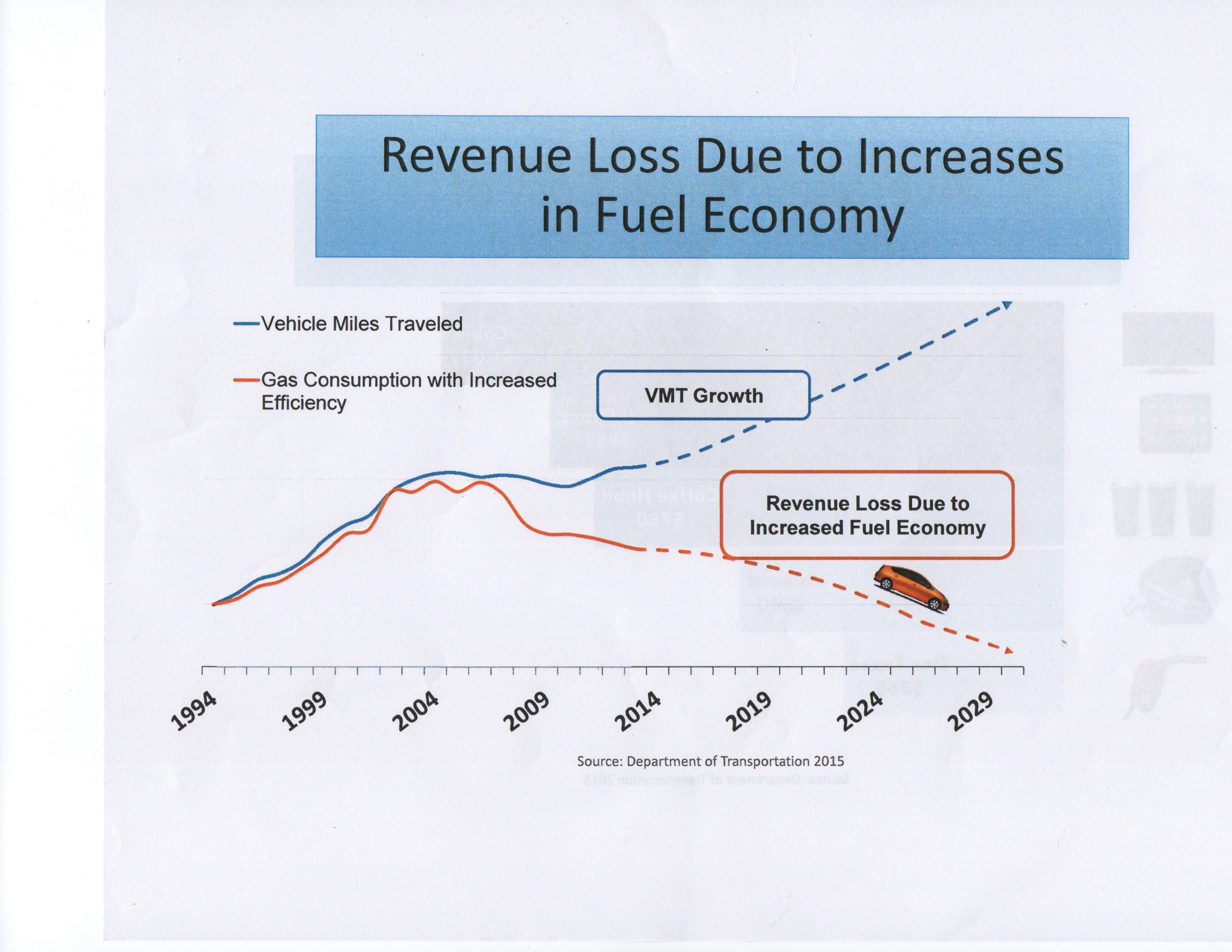 Although the number of new drivers and new cars on the road are increasing, as are the number of vehicle miles being driven by those drivers, the trend toward increasing efficiency will have the continual effect of reducing income brought in from the gas tax, according to the Department of Transportation.