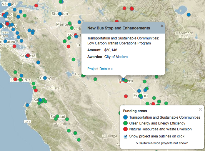 For now, TransForm’s map is the go-to place if you have questions about what the cap-and-trade revenue is invested in. The Air Resources Board’s annual GGRF investments report is due soon (here is a PDF of last year’s report), but even that will not have as much project-specific data as TransForm’s map.