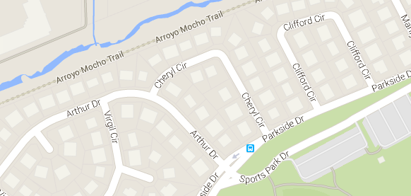 You can see from the map above that the neighborhood is full of loop roads that don’t connect to much. In fact, Parkside is really the only way through here, even by bike. Just east of this point there’s a path connecting to the trail that can be seen at the top. But this single block is the only section that’s marked with a lane.