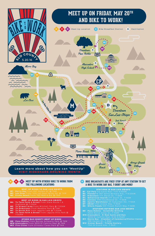 SAN LUIS OBISPO COUNTY‘s Bike to Work Day will be held tomorrow, May 20. Not having a bike is no excuse not to participate, because the County’s RideShare will set you up with a free rental bike for the day, upon request here.