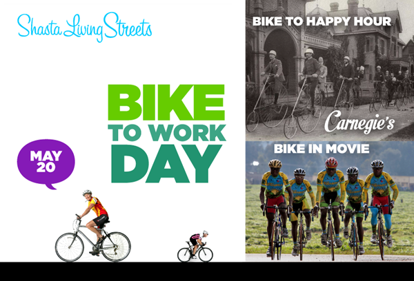 REDDING‘s Bike to Work Day—the amazing start to a new habit!—will happen tomorrow, May 20, starting off with a free breakfast for bike riders. It includes a Bike to Happy Hour (Carnegie’s, starting at 4 p.m.) and a Bike-In Movie (8 p.m. in the Promenade in downtown Redding). The Mayor and other local dignitaries will talk about creating a bicycle-friendly Redding, followed by a screening of Rising From the Ashes.