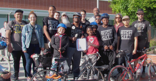 Alex Knox presented a Mayoral Certificate of Excellence to Najari Smith and Rich City RIDES “in recognition of the fifth annual Rich City Ride of Silence, which reflects on the pain and loss experienced by cyclists and other victims of violence in Richmond, and in appreciation of the leadership of Rich City RIDES in promoting health and wellness in our community.” Smith gathered together his crew of supporters and shared the award with them, thanking everyone for their hard work.