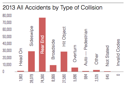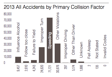 In the 2013 report, the most recent year for which data is available, more than 71,000 collisions were attributed to speeding. Likewise, rear-end collisions occurred far more often than “sideswipes,” the second-leading type.