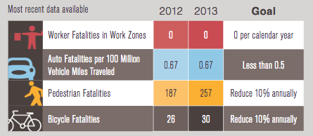 This Mile Marker also charts progress towards some of the department’s 2020 goals, including reducing pedestrian and bicycle fatalities—and let’s just say, there is a ways to go on that one. Fatalities rose between 2012 and 2013, rather dramatically, instead of dropping. What’s happened in the four years since?