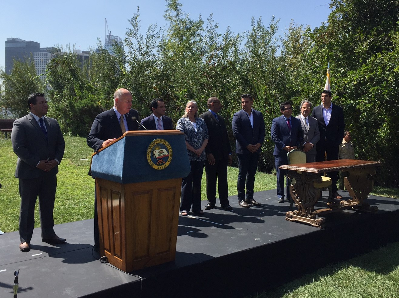 In a signing ceremony at Vista Hermosa Park in Los Angeles today, Governor Jerry Brown signed legislation extending state climate change targets through at least 2030. The governor was joined by key legislators who shepherded the legislation’s approval. These included Senate President Pro Tempore Kevin De Leon, Assembly Speaker Anthony Rendon, Senator Fran Pavley, Assemblymember Eduardo Garcia, Senator Ricardo Lara, and assemblymembers Reggie Jones-Sawyer, Jimmy Gomez, Richard Bloom, and Matt Dababneh.