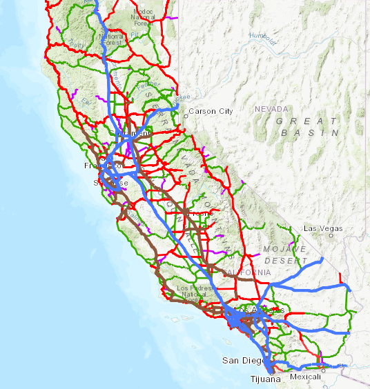 The VMT tool is limited to particular highway types in the 37 “urbanized counties” in California. These are marked in blue, brown, and red here as well as on the map below.