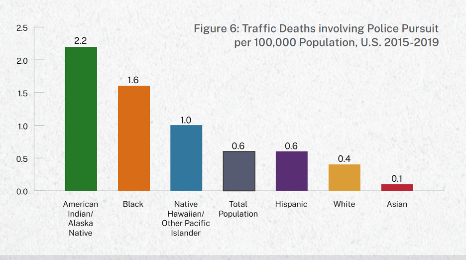 There’s vanishingly little national data on the body count that follows violent police car chases — much less which groups are most likely to be killed in such pursuits. The GHSA found that Indigenous road users were more than five times as likely to be killed in a police pursuit than White ones, and Black road users four times. Those rates include not just the driver who is the subject of the chase, but also those drivers’ passengers, people detained in the back of police vehicles, law enforcement officers themselves, and bystanders who get caught up in the violence.