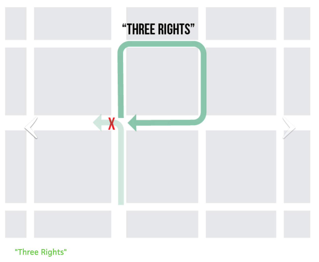 There’s also the so-called Jughandle intersection, also known as the Jersey Left, which most street-safety advocates like less because it’s essentially a slip lane (more on that in a sec.) But there’s a simple and elegant alternative to the maneuver….namely, just making three consecutive rights.