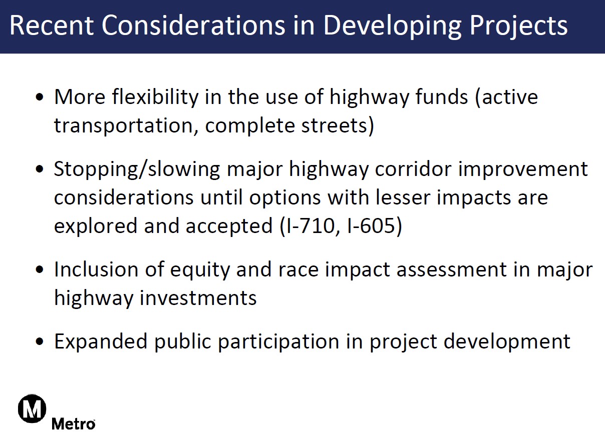 Many Metro staffers are now slathering the word equity on their pitches for freeway widening. For the past decade-plus, Metro had pushed harmful 710 widening that would have displaced hundreds of families and increased pollution in already pollution-burdened communities. Presentations about Metro’s new 710 Freeway widening task force repeatedly emphasize that 710 Freeway widening is being re-envisioned to support equity. Though there is no agenda posted yet on the Metro’s 710 widening task force webpage, next week’s meeting (which Metro announced would be on Monday, October 19) is supposed to focus on Metro’s equity assessment tool.