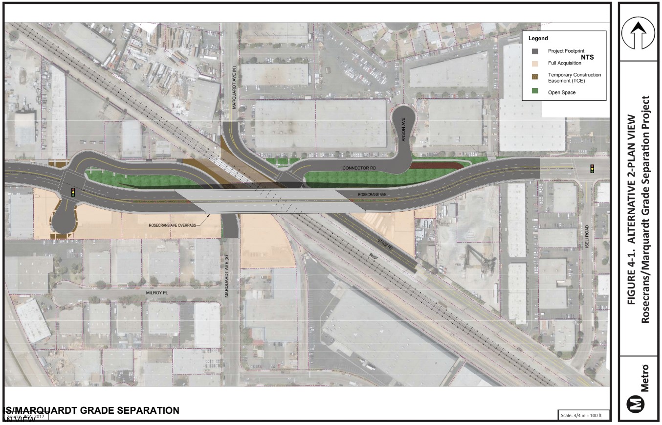 Metro’s project will add a new Rosecrans Avenue overpass and new connector roads. The project will sever the relatively low-traffic Marquardt Avenue, which is already interrupted by nearby creeks (Coyote Creek and its tributary La Cañada Verde Creek) and the 5 Freeway.