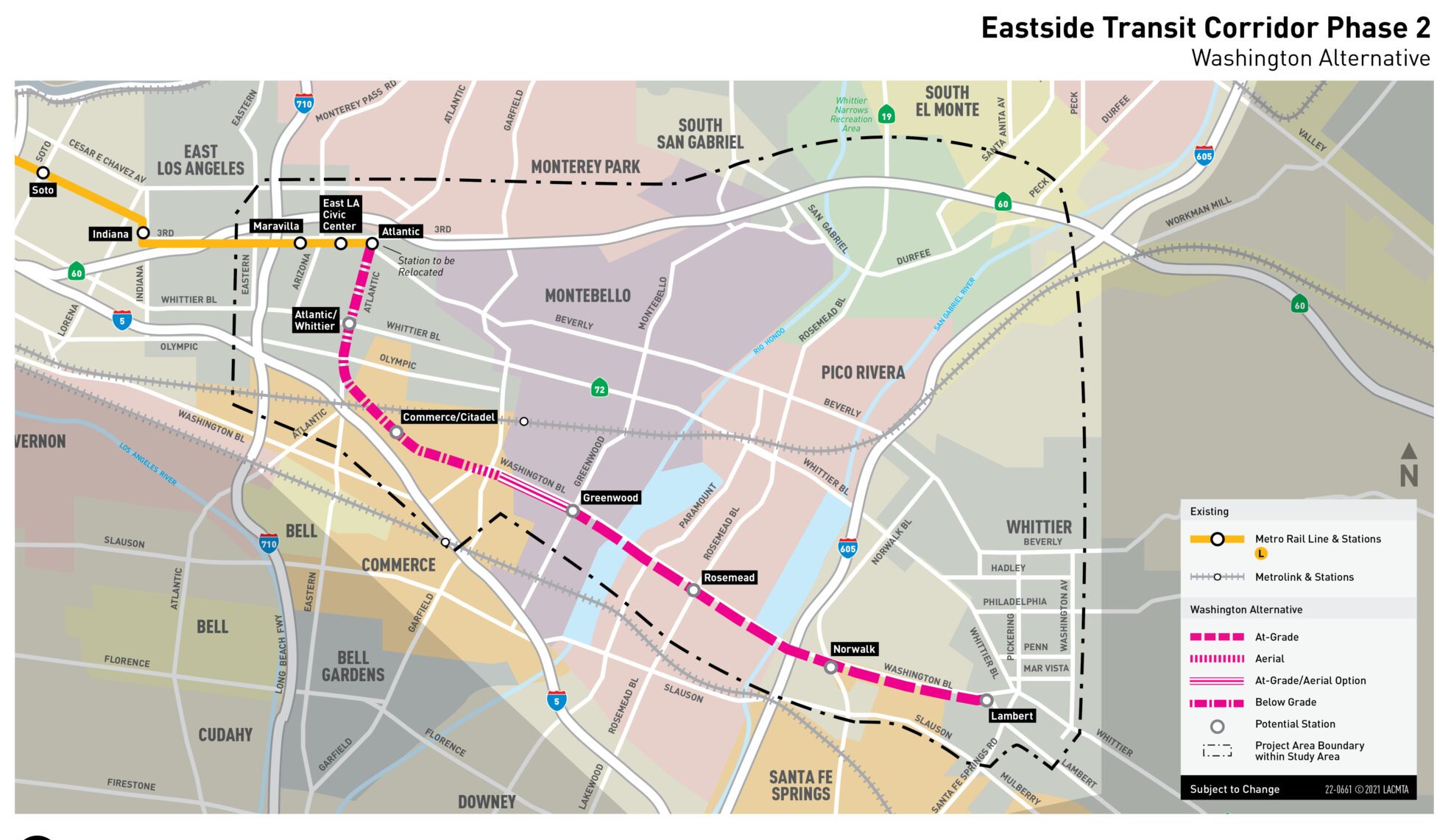 According to the Metro staff report the agency already has $3 billion set aside for the Eastside extension project, but the funding picture is a little opaque, with some Measures R and M funding, and other anticipated sources. At the time Metro’s sales tax measures were passed, the proposed Eastside extension potentially included two alignments spanning both the Gateway Cities and the San Gabriel Valley sub-regions. In 2020, Metro selected the southern Gateway Cities alignment (called the Washington Boulevard Alternative), which resulted in the splitting up some of funding.