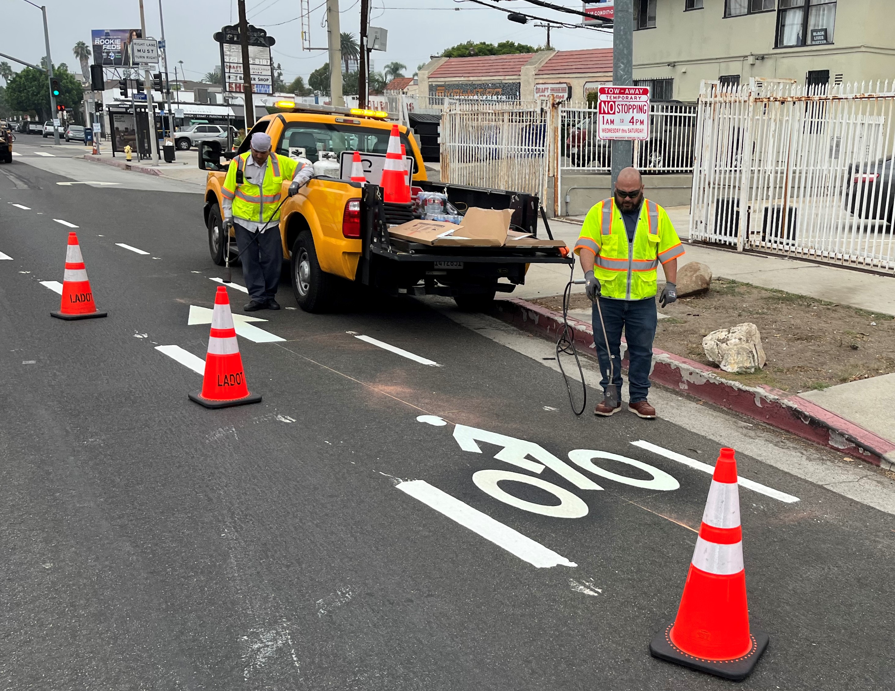 The city of L.A. Transportation Department (LADOT) is in the field today installing parking-protected bike lanes on San Vicente Boulevard in the Mid-Wilshire neighborhood just east of Little Ethiopia.