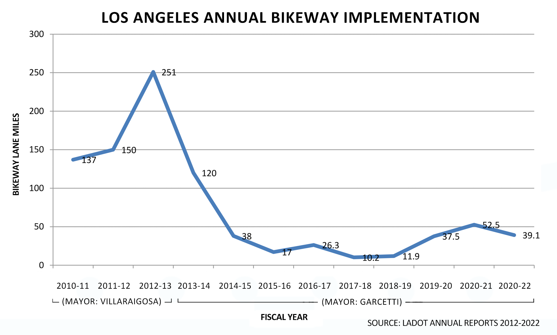 Garcetti’s record speaks louder than his spin. He presided over a dismal slump in bikeway implementation. He inherited a department that had exceeded 100 bikeway miles annually in the final years under Mayor Antonio Villaraigosa. Under his watch the city’s bikeway output plummeted to less than 40 miles, then sputtered around with several years under 20 miles.