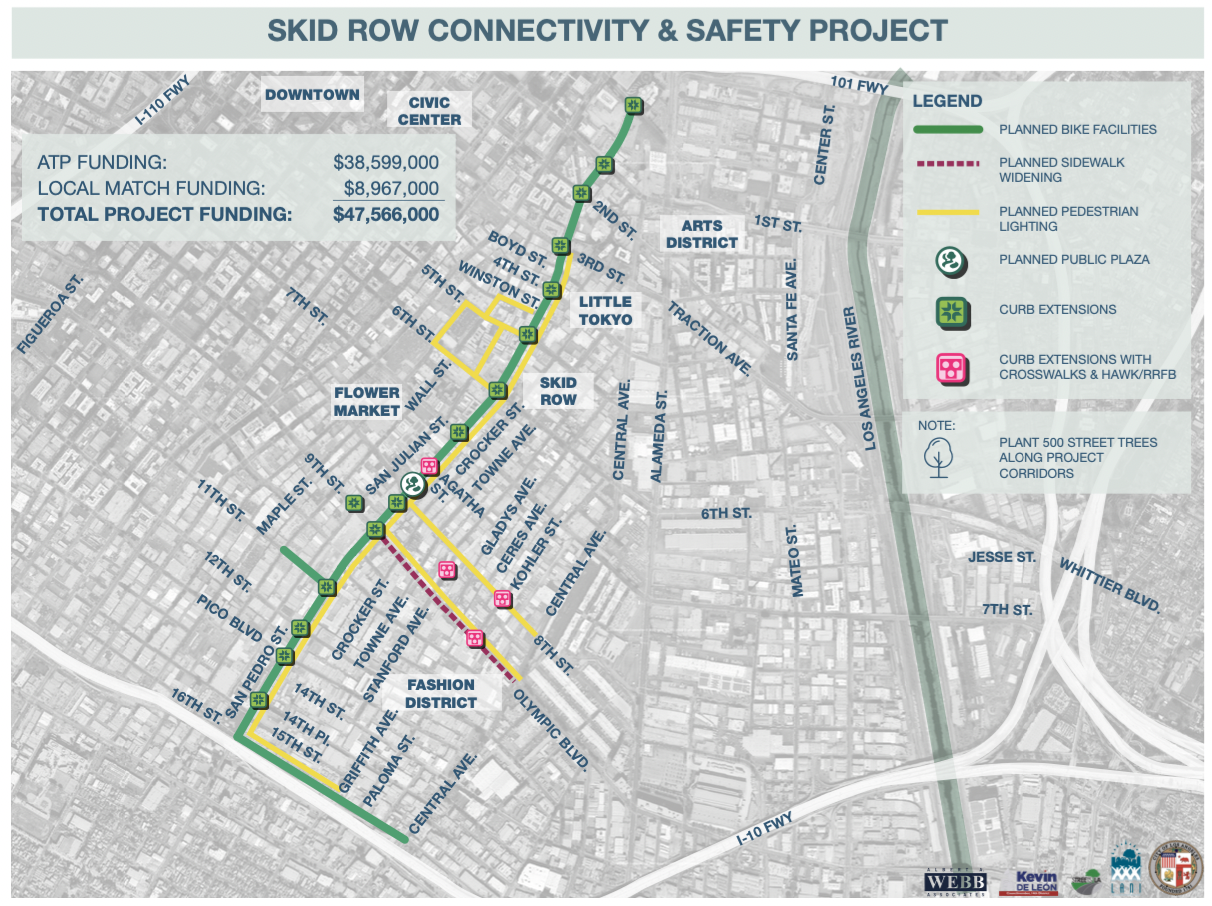Last night, disgraced councilmember Kevin de León tweeted out a video celebrating the $38.6 million state Active Transportation grant that, together with nearly $9 million in local matching funds, will bring a total of $47.5 million in bike and pedestrian infrastructure to his district via the Skid Row Connectivity and Safety Project.