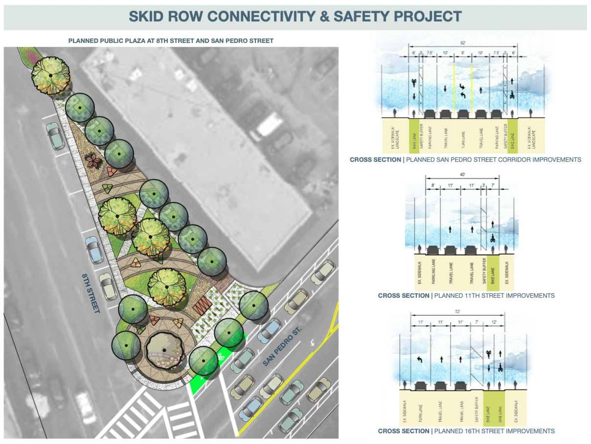 Others were angered by his having tried to position himself as a champion of Skid Row while misrepresenting the project as the “single largest infrastructure investment in the history of this [Skid Row] community.” The project is likely named “Skid Row Connectivity” because anchoring it in a disadvantaged community gives it a leg up with regard to funding criteria. But the surrounding areas will benefit just as much, if not more. The reconstructed sidewalks, pedestrian lighting, and street trees will be implemented throughout the project zone, for example, but San Pedro – which passes through just a few blocks of Skid Row (below) – will get the bulk of the infrastructure, including 2.4 miles of protected bike lanes and intersection improvements (curb ramps, curb extensions, and enhanced crosswalks). The Flower District – not Skid Row – will get a new public plaza with benches, lighting, hydration stations, and bike share stations at 8th St/San Pedro. And the Piñata District will get wider sidewalks and crosswalks with flashing beacons. [See the full run-down of amenities here or here.]