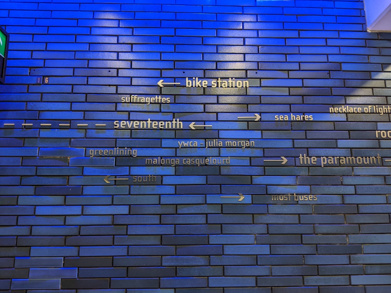 Expecting glass to last in the Bay Area, sadly, is a little unrealistic. Additionally, this was a missed opportunity to improve wayfinding in the station. Below is a newly illuminated and polished sign with directions, but it’s also the kind of wayfinding that’s a little too artistic for its own good and is easy to miss: