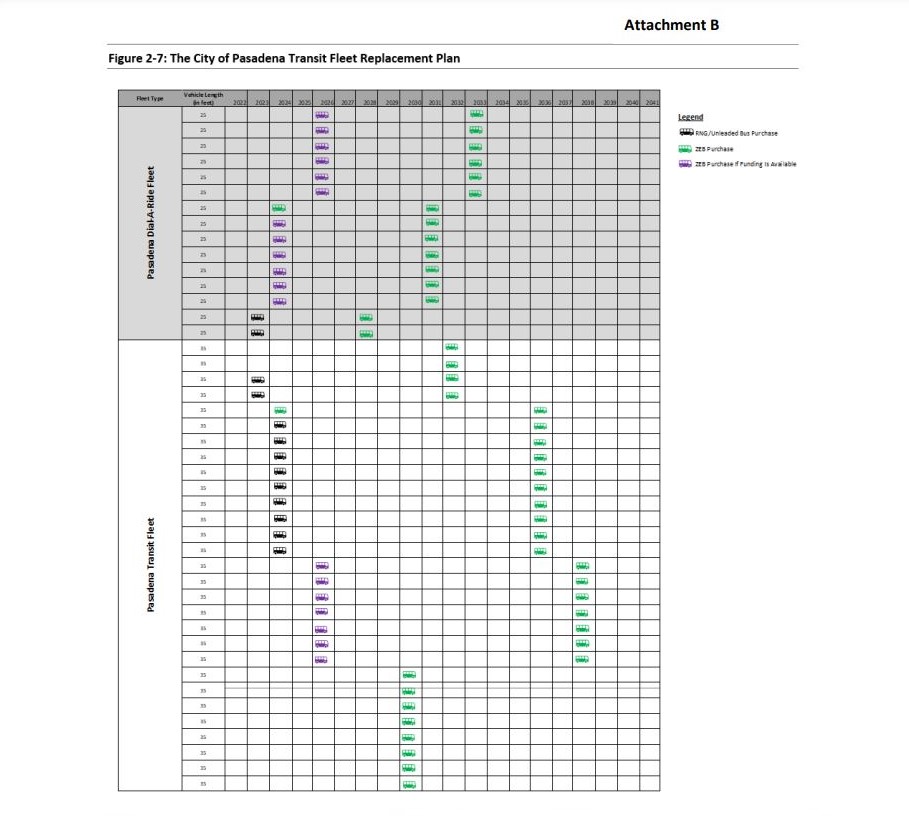 Pasadena Transit’s Zero Emission Bus (ZEB) Rollout Plan was adopted by city council in late January. The plan lays out an “aggressive” schedule for the city’s bus service to replace both its 35-foot fixed-route buses (29) and its 25-foot dial-a-ride vehicles (44).
