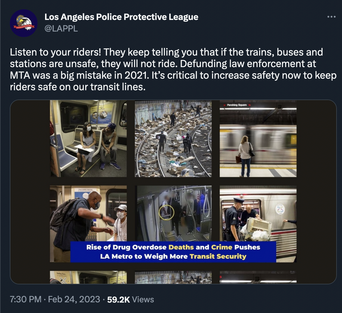 In an effort to capitalize on an L.A. Times story about the rise in drug-related deaths on the Metro transit system, the Los Angeles Police Protective League (LAPPL) decided to tweet a racism.