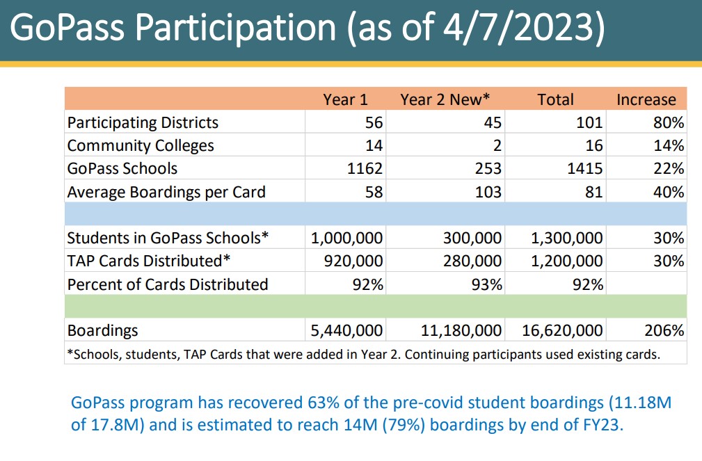 As of early May (nearly two years into the program), overall student free transit boardings have totaled 16.6 million.