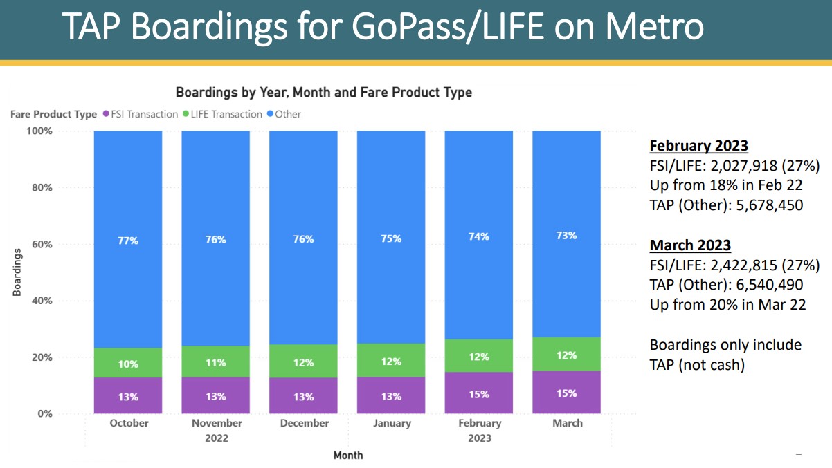 Student GoPass boardings currently comprise 12 percent of Metro non-cash boardings. (According to another presentation last week, about 43 percent of Metro boardings are cash.)