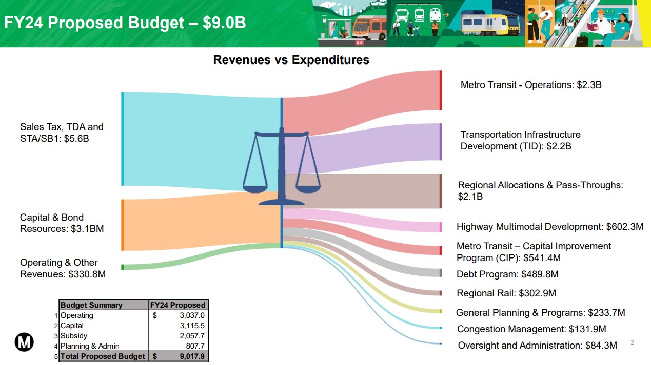 Yesterday, the Metro board approved the agency’s $9 billion fiscal year 2023-24 budget. There is a lot of good stuff in it. Metro’s building rail. Metro is touting modest funding going toward new bus lanes, new on-bus camera bus lane enforcement, and increased money for transit cleanliness and all-door bus boarding.