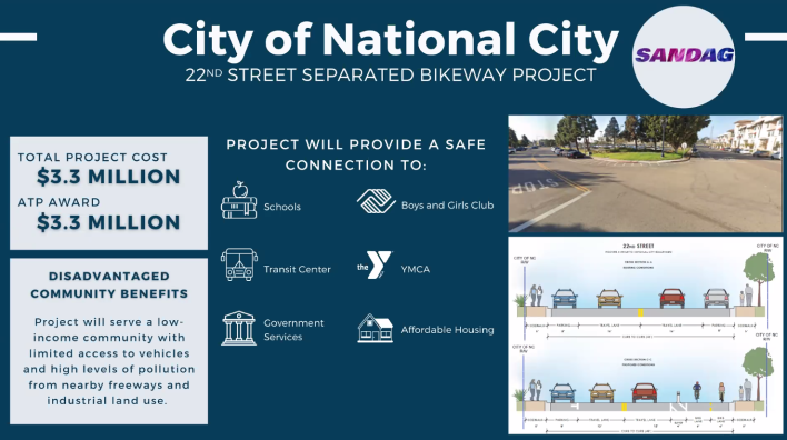 - SANDAG, City of National City: 22nd Street Separated Bikeway, $3 million. This is low-income community with limited access to vehicles and high levels of pollution from nearby freeways and industrial land use, with a transit center but without safe facilities to walk and bike to it. This project will construct a bike path and separated bikeways, bike signals, sidewalks, and intersection timing improvements.