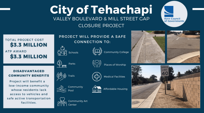- KernCOG, City of Tehachapi: Valley Boulevard and Mill Street Gap Closure Project, $3 million. Currently in this area, children walk to school on muddy shoulders, and bicyclists must mix with vehicle in fast-moving traffic. This project will “close a gap in Tehachapi’s active transportation network” by adding sidewalks and on-street bike lanes.