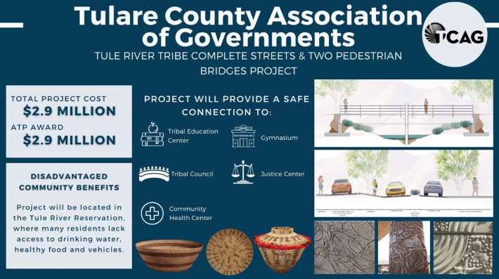 - Tulare County Association of Governments: Tule River Tribe Complete Streets and Two Pedestrian Bridges Project, Phase 1, $3 million. This project is located on the Tule River Reservation, where many residents lack access to drinking water, healthy food, and vehicles. The Reservation has limited active transportation facilities, leaving residents to choose between walking and biking in the traffic lanes or dirty and muddy shoulders. This project will add sidewalks, crosswalks, curb ramps, intersection lighting, and a multi-use trail. In addition, the project includes non- infrastructure bike and pedestrian skills courses for children. Staff also pointed out that traditional basket weave designs of the Tule River tribe will be incorporated into some of the built elements.