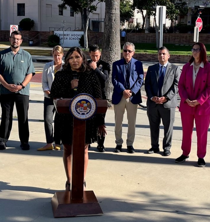Glendale leaders rallied this morning in front of Toll Middle School to support the passage of the California’s latest speed limit bill. A.B. 645, authored by Assemblymember Laura Friedman, would enable a five-year speed camera pilot in six California cities: Glendale, Long Beach, Los Angeles, Oakland, San Francisco, and San Jose. Friedman spoke of the need to pass A.B. 645 “to stop the rising tide of deaths we are seeing on our streets.”