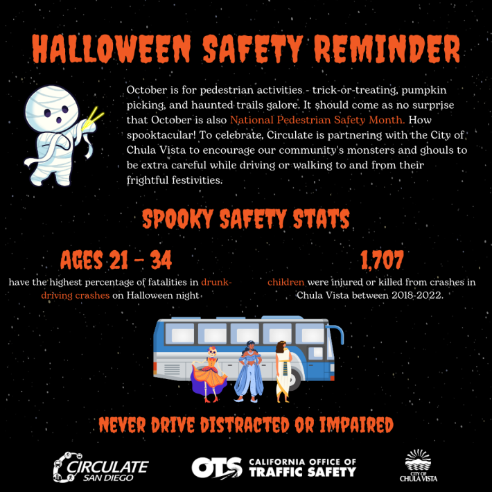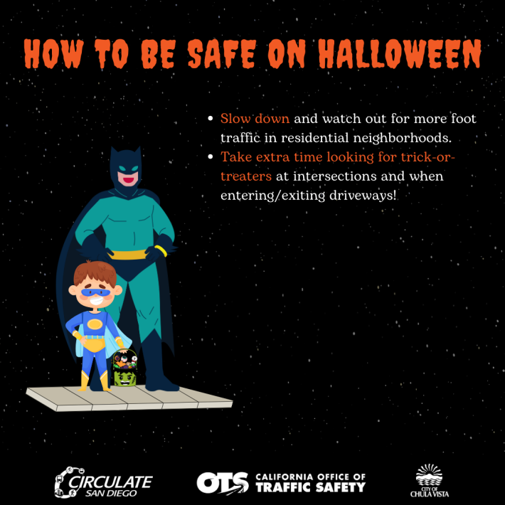 That’s why Circulate San Diego is issuing a fang-tastic reminder encouraging drivers to be extra careful as more children are out walking the neighborhood haunting for treats.