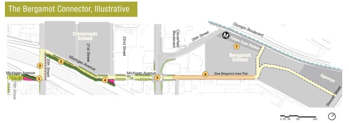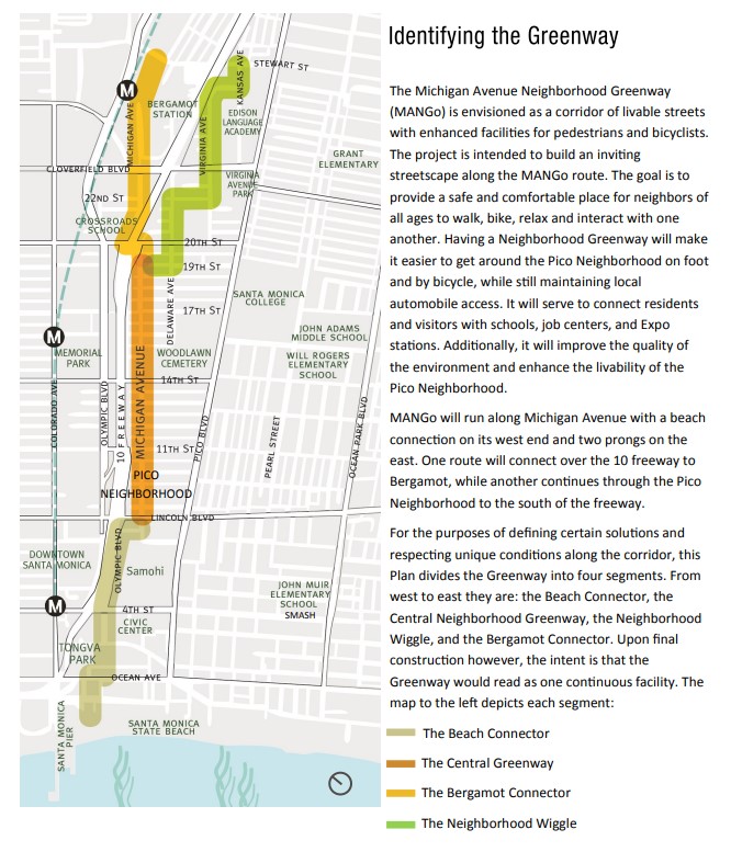 The city’s MANGo concept plan includes a greenway/bikeway west to the beach, and east via two forks: Bergamot Connector (to the Metro 26th Street/Bergamot E Line Station) and Neighborhood Wiggle (to Stewart Street).