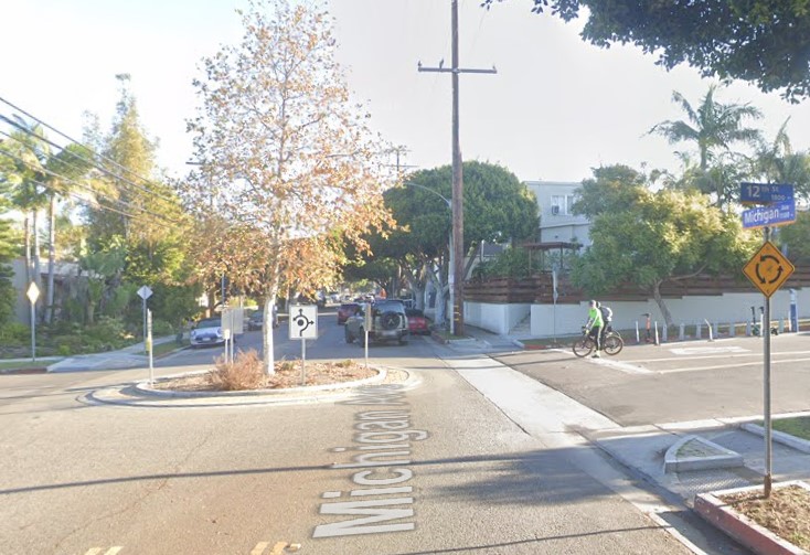 An initial “Central Greenway” phase of Santa Monica’s MANGo opened in 2015. Michigan was already a fairly quiet street. Ambitious early proposals were scaled back due to resistance from, according to Rose, mainly one vocal neighbor. To date, the MANGo project calmed traffic a bit by installing a half-dozen small traffic circles, plus some modest bulb-outs/curb extensions.
