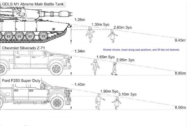 Seriously, children are more visible in front of an Abrams battle tank than they are in front of a pickup truck. The National Highway Traffic and Safety Administration says every year there are about 400 deaths and 20,000 injuries every year because drivers can’t see what is right in front of them.
