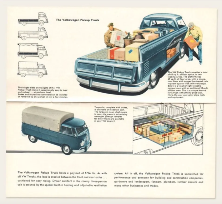 When Volkswagen designed a pickup truck based on their van, they had to make the bed high enough to get over the rear-mounted engine. But they used the space in between for more storage. All VWs were decidedly non-skeuomorphic, they let the engineering drive the design.