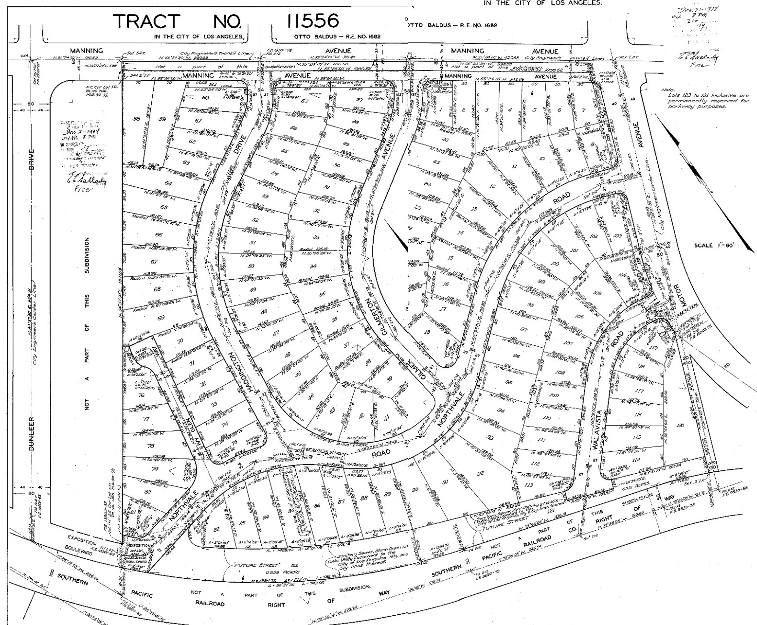 When Cheviot Knolls was built, Southern Pacific’s single-track electric freight and passenger railway (the latter popularly called Red Cars) ran on a 100-foot wide right of way south of 15 residential lots.