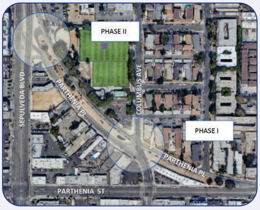 - Phase II includes two large pedestrian islands and a new “stop-controlled, right-turn-only street,” all located at Sepulveda Boulevard and Parthenia Place.