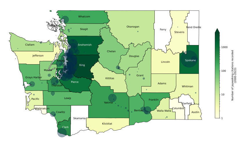In what may be the first statewide analysis of the housing status of pedestrians stopped for crossing against a signal, walking on the roadway, or otherwise using their streets in an unsanctioned way, researchers at Transportation Choices Coalition found that unhoused folks were involved in 41 percent of all stops between 2000 and 2023. And because just 0.4 percent of residents of the Evergreen state are unhoused, that means they’re being overrepresented by a factor of more than 100.