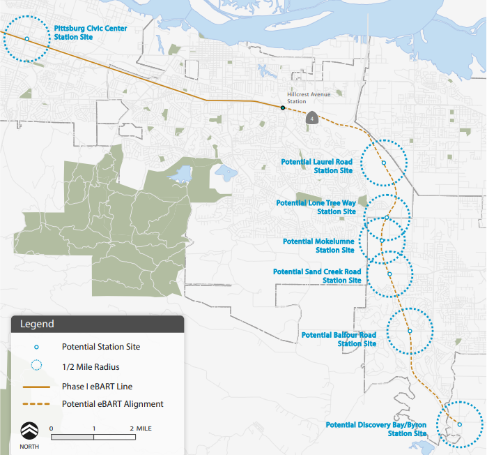 The bridge is part of a larger development for the area. Plans are afoot to extend the eBART line along Highway 4 from its current terminus at Hillcrest Avenue Station, with a station next to the bridge (the map below, from Brentwood planning documents, shows potential station locations).