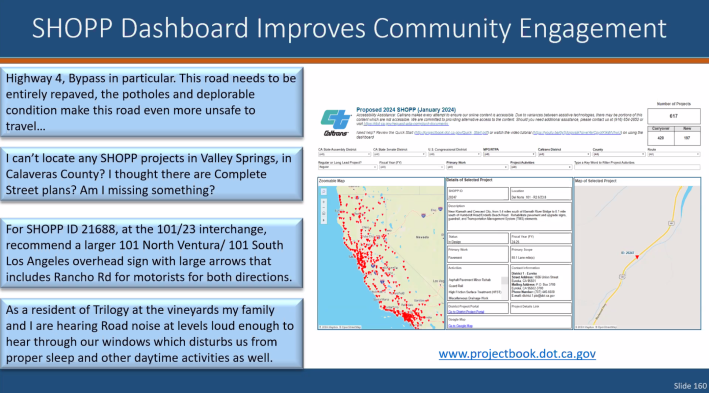Notable, too, is what seems to be an increase in public participation at these meetings. This may be because the state’s efforts at transparency are starting to bear fruit. For example, those multimodal projects, and even portions of projects, are broken out in the STIP; the SHOPP, meanwhile, has debuted a new publicly-accessible dashboard showing where money is being spent and for what.
