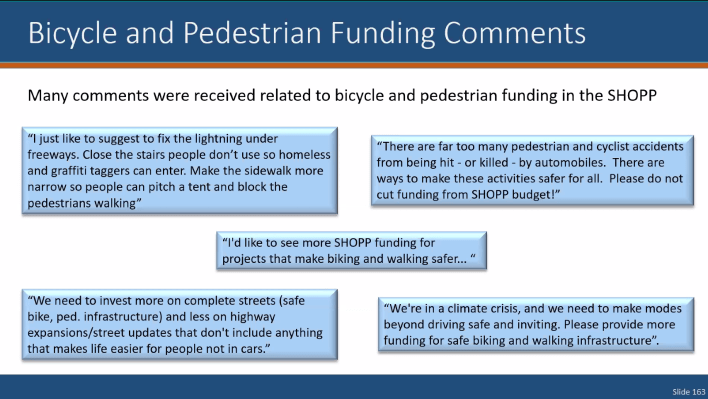 At another point in the meeting, State Asset Management Engineer Michael Johnson said Caltrans had received many public comments on the SHOPP. “By far we received more comments on bike and pedestrian concerns than anything else,” he said.