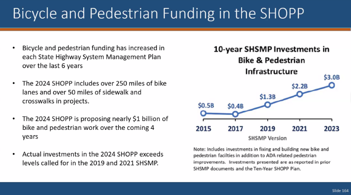 - Adopted the 2024 State Highway Operations and Protection Program (SHOPP), a four-year, $21 billion list of locally prioritized state highway projects. According to Caltrans Chief Deputy Director Mike Keever, the 2024 SHOPP is the first one based on the Climate Action Plan for Transportation Investments (CAPTI), and it includes adjustments made to the “pipeline” of projects to align them with that state plan. It also contains “nearly $1 billion” in bike and pedestrian projects, he said. That includes 250 miles of new bike lanes (but of what quality? More about that below).