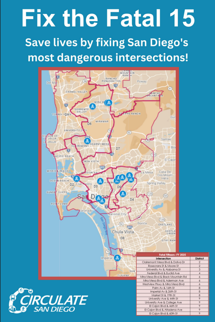 At the request of several city councilmembers, the advocates provided an estimate for the cost of their suggestions. “Based on Circulate’s planning department, estimates from prior years, work of the Independent Budget Analyst, and information from the Transportation department, recent fixes like those proposed here have cost an estimated $100,000 per intersection. This would total $1.5 million to fix the ‘Fatal Fifteen’,” they wrote to Mayor Todd Gloria [PDF].