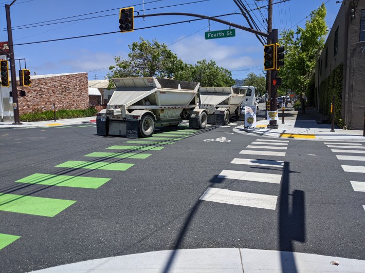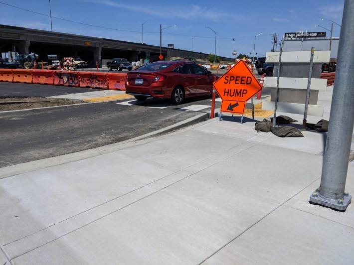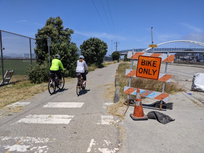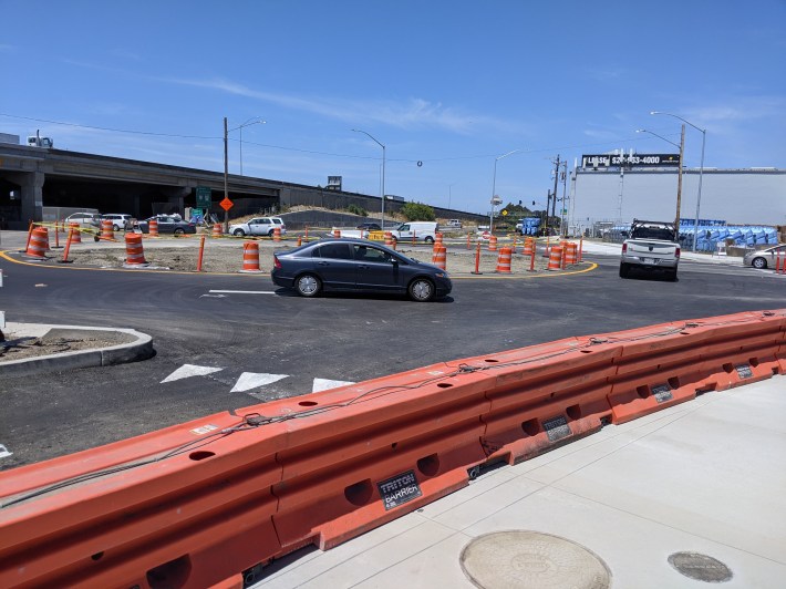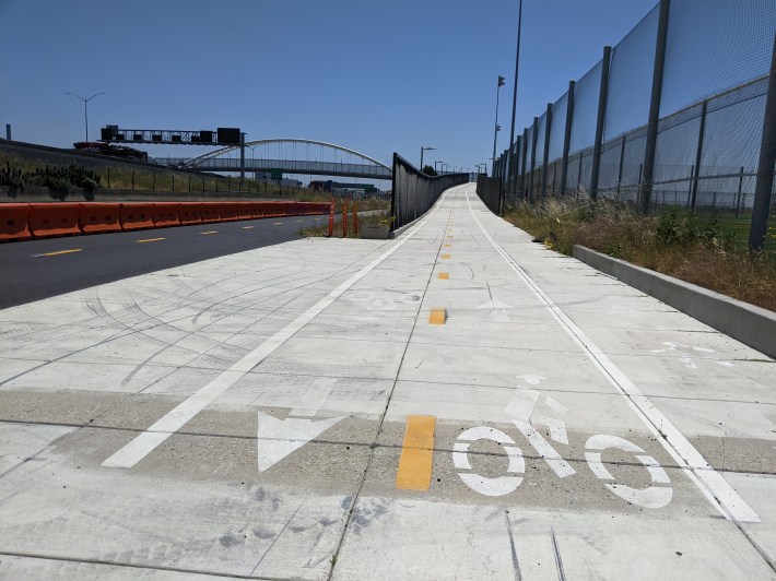 As noted by Bike East Bay, there’s still ongoing work on the car roundabouts. From Streetsblog’s view, it’s great to see Caltrans and the AlamedaCTC finishing bike and walk infrastructure first. Although, as noted in our previous coverage, it would be nice just for once to also see these agencies build some bike infrastructure without it being part of a larger, freeway capacity project. And also as noted in previous coverage, it’s a shame the $43.37 million project—and the protected bike lane that was part of it—just kind of disappears at Fourth Street.