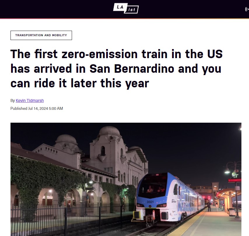 On July 14, LAist published an article claiming that the first zero-emission train in the U.S. has arrived in San Bernardino. The new train is a hybrid (hydrogen power and battery) multiple unit, for Arrow line service. Similar headlines had been used in other outlets over the last few days as well.