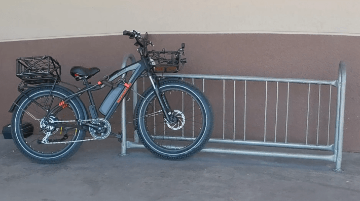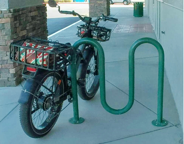 The Bike Rack Map developers also made a video showing the work they’ve done on the first comprehensive Northwest Las Vegas bike parking census and analysis. There they found both bike parking deserts – “oceans” of vehicle parking surrounding a couple of bike racks – and what they call “mirages.” In those pockets, a quick glance at the map might show at least some bike parking, but a closer look reveals they are limited, blocked, difficult to access, or otherwise useless.