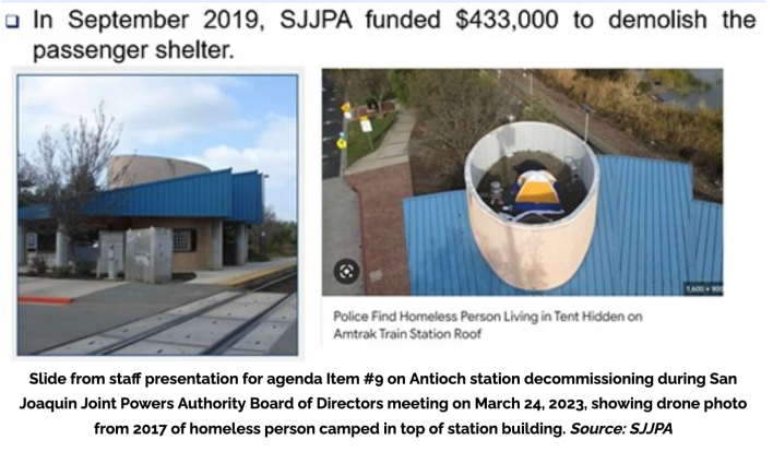 At one point in the long article explaining who said what, the Herald quotes a representative of the SJJPA describing the Antioch station as “a quick platform-only stop with no shelter.” This wasn’t actually true until the city agreed to remove the building on the urging of the Authority. Was the city sabotaged? Or did it sabotage itself?