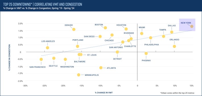 Researchers also looked at the connection between congestion and VMT in the top 25 metro cities and their downtowns during that period.