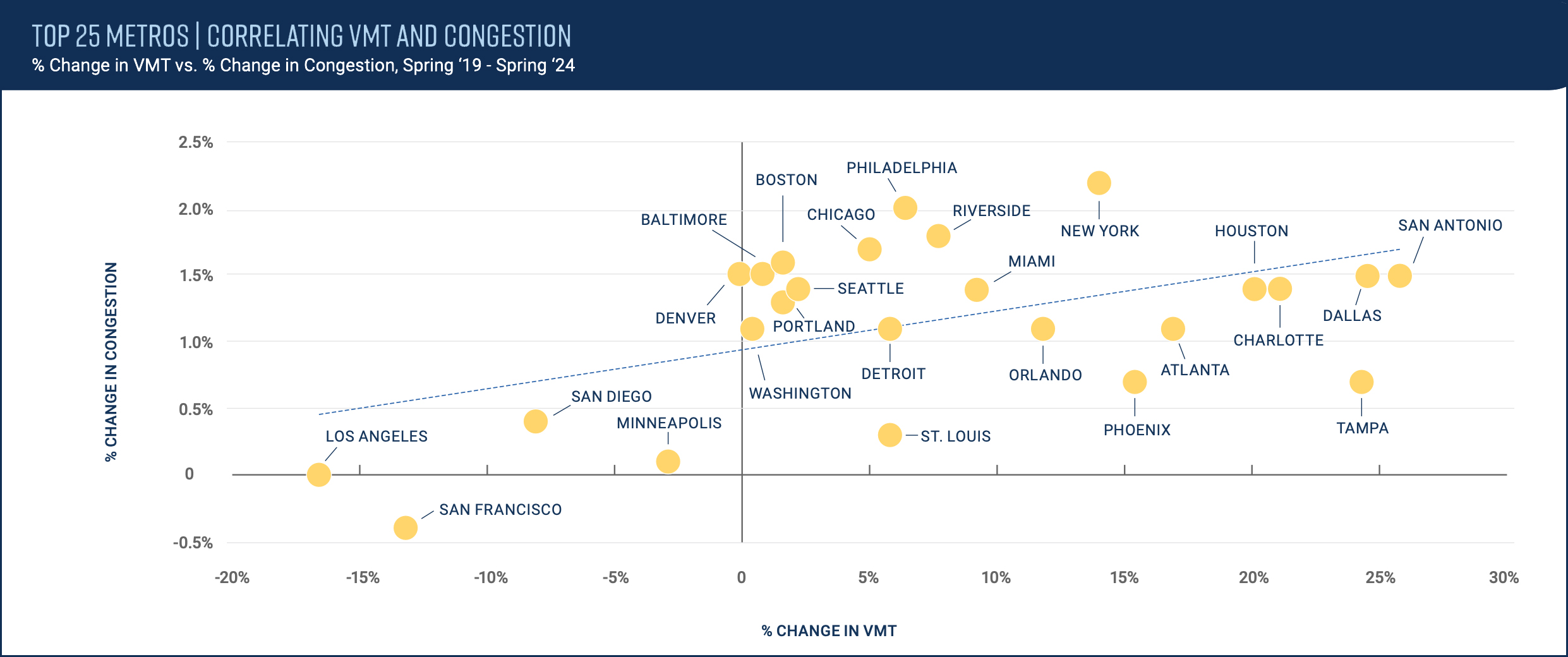 And only two metropolitan areas out of 100 had less congestion in spring 2024 compared to spring 2019. Those two, San Franciscio and Albuquerque, only reduced congestion by less than half a percentage point (0.4 percent and 0.3 percent, respectively.)
