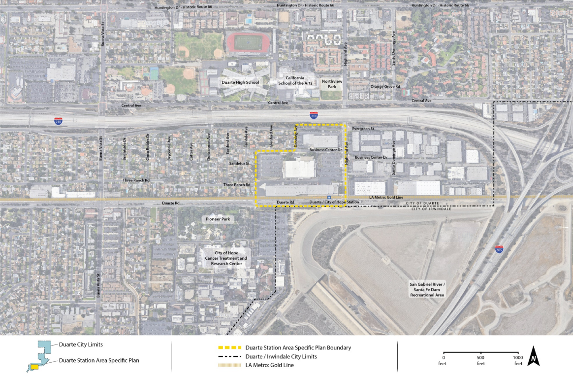 The Specific Plan is focused at and around a 19-acre site adjacent to Metro’s Duarte/City of Hope Station. Its stated goal is to boost transit ridership by transforming the station area from “simply a train stop into an exciting multi-use public gathering place.”