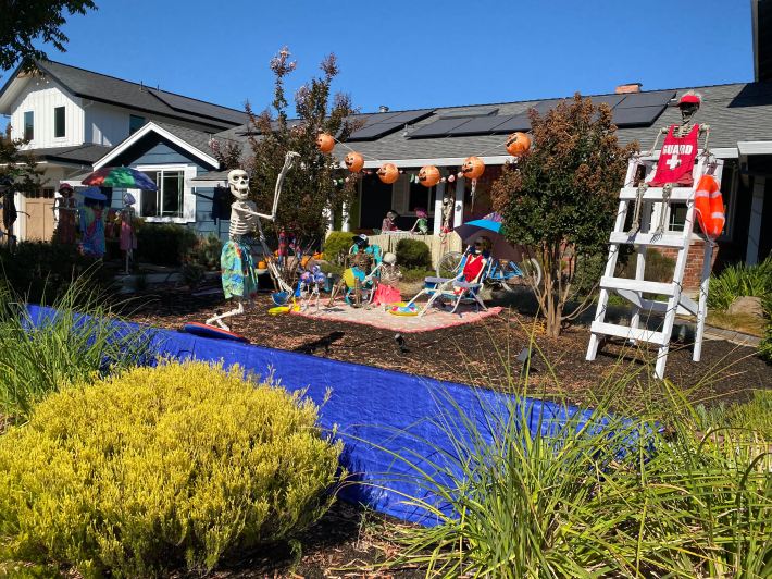 It was a pleasant walk. Our neighborhood is starting its seasonal decorating blitz and I had a chance to see the first wild displays at a leisurely pace. My next-door neighbors have 13 skeletons dressed up around a fake swimming pool in their front yard. Other neighbors are going for the fall harvest look. One large truck was parked up on the curb, not as a decoration but perhaps as a result of inebriation.
